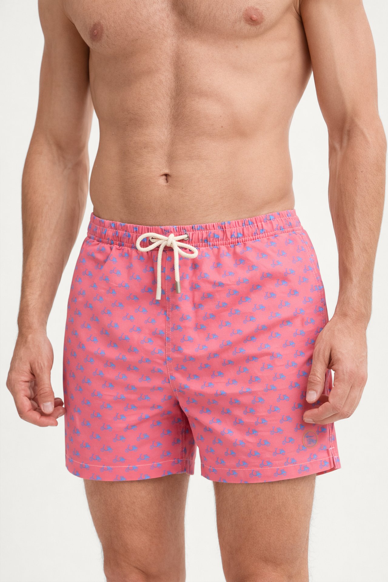 Bañador para hombre rojo con estampado de vespas en azul. Ligero, cómodo y de secado rápido, con forro interior y diseño funcional. Una opción original para playa o piscina con estilo mediterráneo.